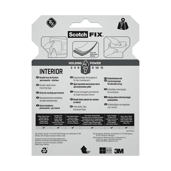 Лента за вътрешен монтаж Scotch-Fix™. Издържаща до 7 кг, тази дунапренова лента може да се използва на закрито и е идеална за боядисани гипсокартонени плоскости, готово дърво, метал, акрил, плочки и стъкло.