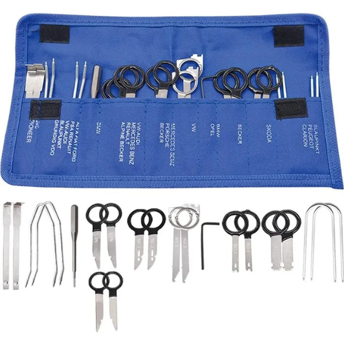 Пълен комплект инструменти за безопасно демонтиране на радио или навигационни устройства. Състои се от 20 части, включително различни приставки и ключове, подходящи за различни модели автомобили. Удобен и лесен за употреба, осигурява безопасно извършване на процедурата без повреждане на частите.