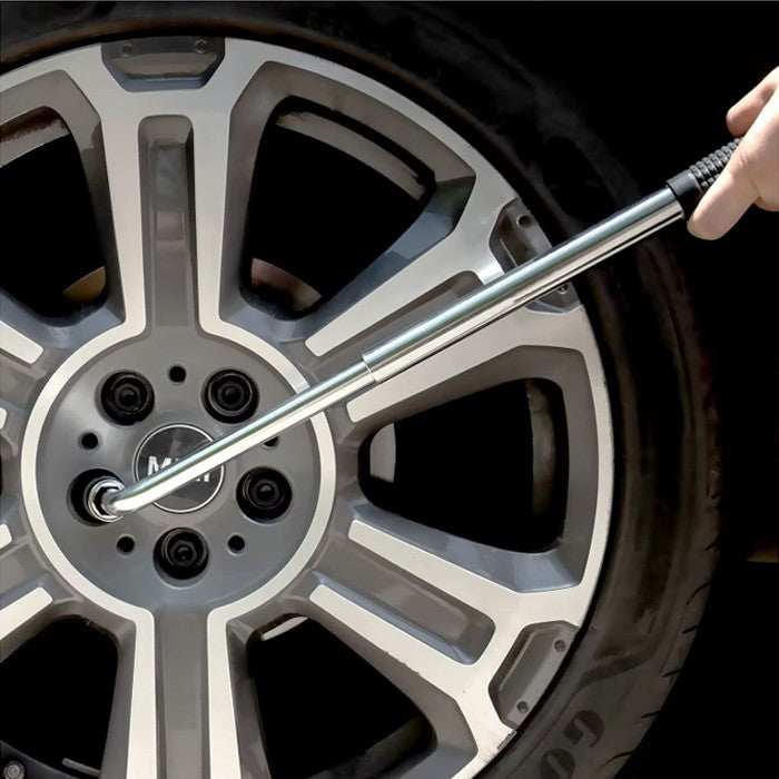Телескопичен ключ за джанти, предназначен за лесно и удобно развиване или затягане на болтове при автомобили, бусове и джипове. Благодарение на разтегателната конструкция от 380 мм до 500 мм, осигурява по-голям лост и по-малко усилие при работа.