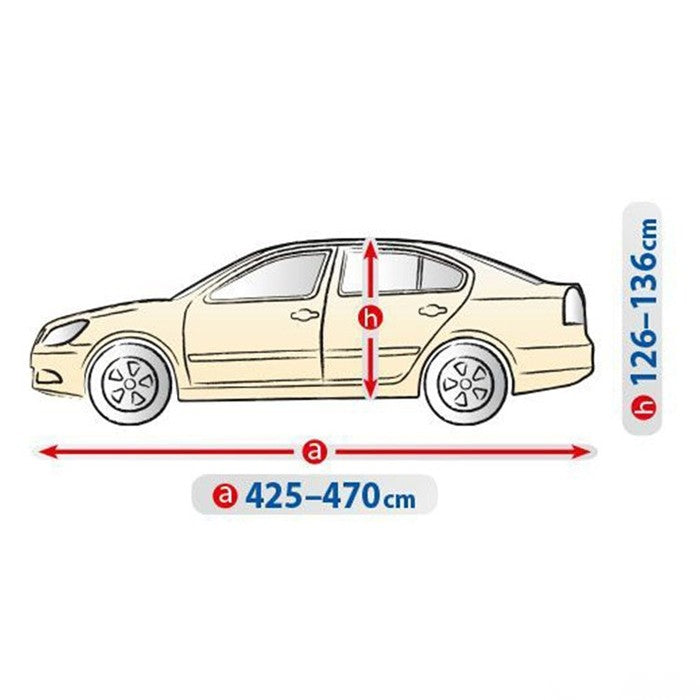 Сравнете формата на вашия автомобил със снимката на продукта (размерите са налични в поле "техническа информация"). Измерете колата си, като обърнете специално внимание на нейната дължина. Крайният размер е обиколката на автомобила, чрез този размер, ще имате по-точна представа кое покривало ще пасне най-добре.
